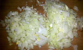 Snijd de middelgrote ui in blokjes. U kunt naar wens meer of minder uien nemen dan aangegeven in het recept.