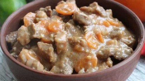 - Na de vorming van een homogene massa, zonder klontjes, giet de saus bij het vlees, meng alles en breng aan de kook, kook op laag vuur om de saus in te dikken. Serveer de meest delicate goulash met een bijgerecht en groene salade.