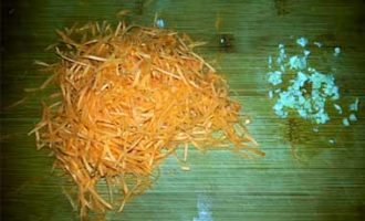 Rasp wortelen, je kunt Koreaanse wortelen gebruiken. Het volume mag ook variëren. Pers de knoflook uit met een knoflookschop.