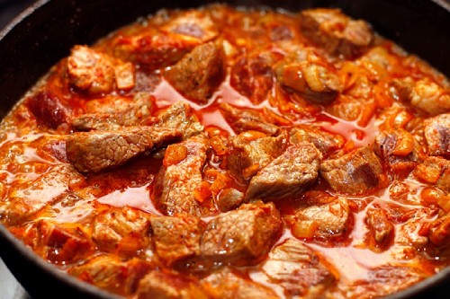 - Doe het gebakken vlees en de uien in het vloeibare mengsel in een pan, sluit de container met een deksel en kook op laag vuur gedurende ongeveer 1,5 uur. Gedurende deze tijd moet de goulash meerdere keren worden geroerd met een spatel.