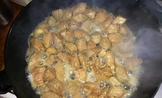 - Snijd het middelgrote vlees in blokjes, bak het in een pan met plantaardige olie.