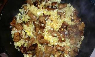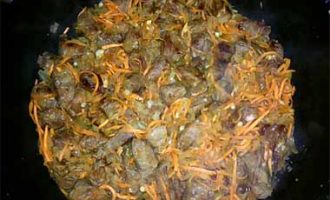 - Snijd de wortel in dunne lange reepjes en snijd de uien in halve ringen. Meng groenten met gegrild rundvlees en bruin ook. Ze mogen niet in verbrande korsten veranderen, het is beter om ze halfbakken te laten blijven.
