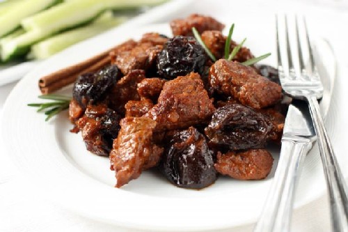 Pruimen geven het vlees een zoetzure smaak en maken het gerecht pittig. Het is toegestaan gedroogde pruimen te nemen, dan moet het van tevoren worden geweekt. Het is goed om een gerecht te koken in een dikwandige vuurpot met een goed sluitend deksel, dan wordt het geblust, zoals in een oven.