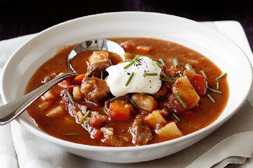 Deze goulash kan worden aangezien voor een stevige tweede of eerste gang, afhankelijk van de kooktechnologie. In tegenstelling tot andere recepten voor rundvleesgoulash, gebruikt het Hongaars aardappelen, dus dit gerecht kan gemakkelijk een vaste maaltijd vervangen.