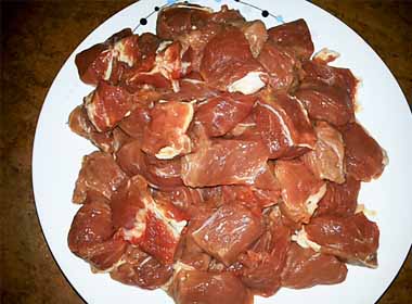- Snijd het middelgrote vlees in blokjes, bak het in een pan met plantaardige olie.