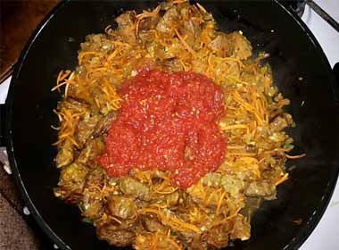 - Combineer tomaten met vlees, uien en wortelen. Giet de inhoud van de vorm met heet water of bouillon zodat alle lagen licht bedekt zijn. Voeg tegelijkertijd tomatenpuree toe en zet de bereiding 1 uur in de oven. Temperatuurbereik - 170-180 graden.