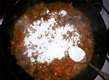- De volgende stap is om tomatenpuree, bloem en zure room naar de vuurpot te sturen. Laat de gemengde ingrediënten 15 minuten sudderen.