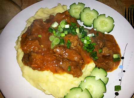 Het is beter om gearomatiseerde rundergoulash met jus te serveren in combinatie met aardappelpuree en groenten.