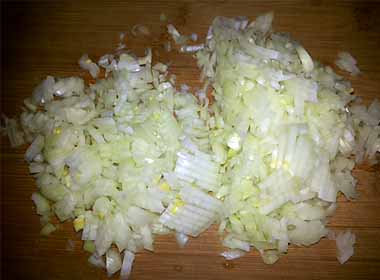 Snijd de middelgrote ui in blokjes. U kunt naar wens meer of minder uien nemen dan aangegeven in het recept.