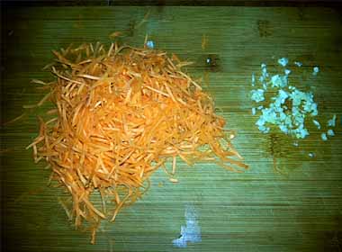 Rasp wortelen, je kunt Koreaanse wortelen gebruiken. Het volume mag ook variëren. Pers de knoflook uit met een knoflookschop.