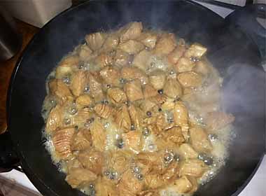 - Snijd het rundvlees in repen, zorg ervoor dat er geen films op het vlees achterblijven. Rol elke reep licht in bloem en bak 7-10 minuten in plantaardige olie. Het is belangrijk dat het vlees na het wassen droog is en niet teveel bloem “oppakt”. Tijdens het frituurproces moet je erop letten dat de bloem niet verbrandt.