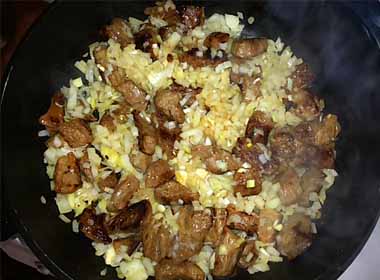 - Snijd de ui in halve ringen of blokjes, bak ook met het vlees goudbruin.