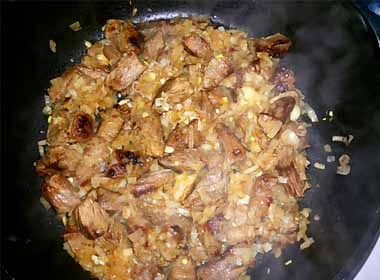 - De eerste stap is om het vlees in een pan te bakken. Om dit te doen, snijd het in blokjes, meng met bloem en bruin in zonnebloemolie. Breng het vlees vervolgens over in een vorm of pot.