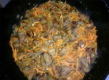 - Snijd de wortel in dunne lange reepjes en snijd de uien in halve ringen. Meng groenten met gegrild rundvlees en bruin ook. Ze mogen niet in verbrande korsten veranderen, het is beter om ze halfbakken te laten blijven.