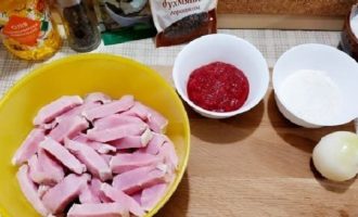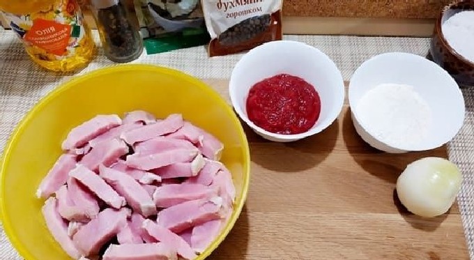Voor het koken moet het varkensvlees worden gespoeld en vervolgens in stukjes worden gesneden (het is handig om dit in blokjes of middelgrote reepjes te doen). Tegelijkertijd zullen we bloem, gepelde uien, tomatenpuree en smaakmakers bereiden.