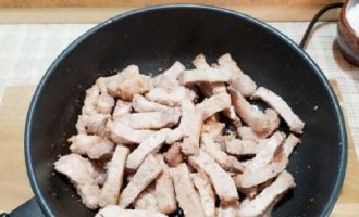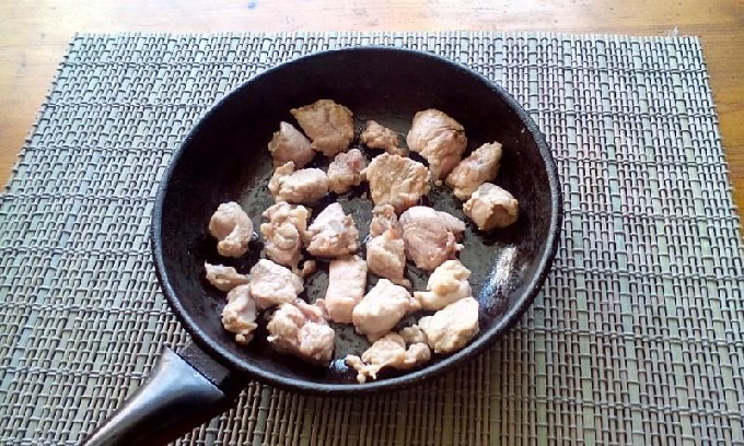 - Snijd het varkensvlees in vrij grote blokjes. En bak in plantaardige olie, voorzout en bestrooi de stukjes met kruiden, tot ze goudbruin zijn gedurende 10 minuten.