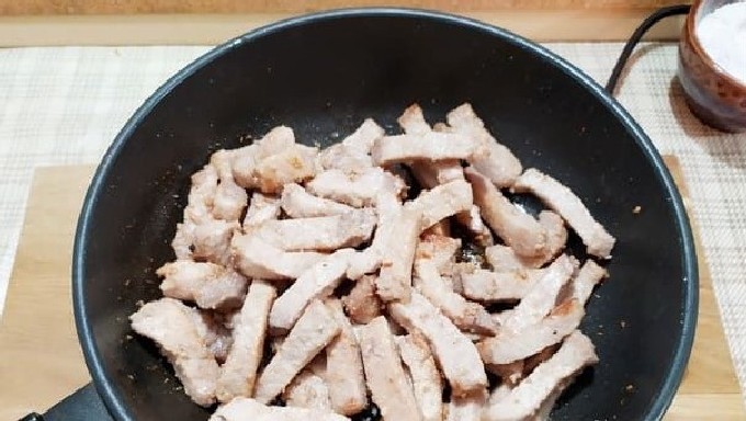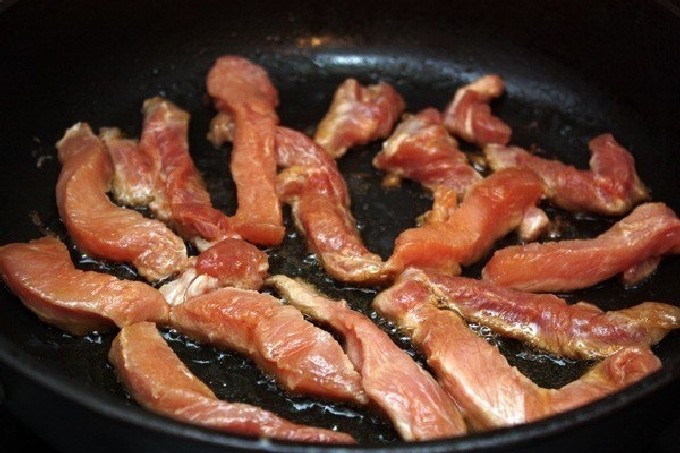 - We nemen een vrij hoge koekenpan, gieten er ongeveer 2 eetlepels op. plantaardige olie en verhit.Leg de stukken vlees, bestrooi ze met kruiden naar wens en zout. We bakken de stukjes varkensvlees 7-10 minuten, gedurende deze tijd zullen ze goed bruin worden.