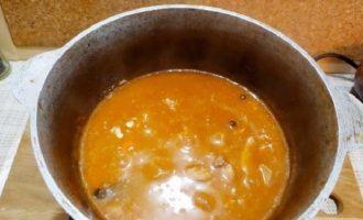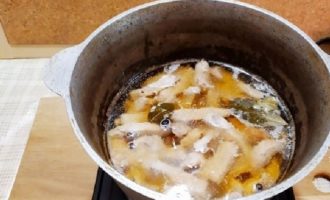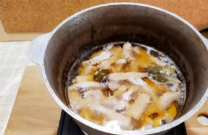 Nu nemen we een pot water en doen het varkensvlees erin. Het is noodzakelijk dat het vlees volledig onder water staat. We sturen naar het fornuis om te koken. Dan maken we een laag vuur en gooien het laurierblad, peperkorrels erin. We stoven het vlees.