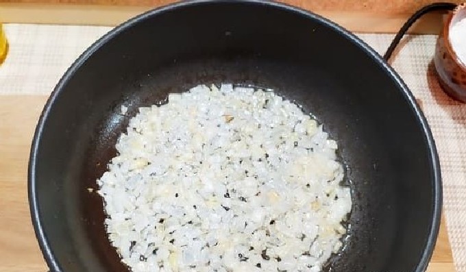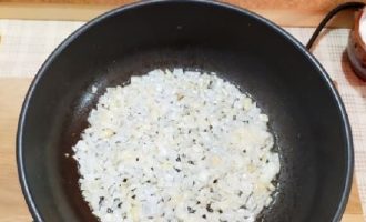 - Voeg de ui toe aan het vlees, bak tot ze transparant zijn, letterlijk een paar minuten.
