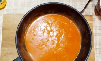 Wanneer de ui helderder wordt en zacht wordt, voeg je bloem toe en roer je goed door. Nu introduceren we tomatenpuree en water. We introduceren water in een zodanige hoeveelheid dat de hele massa qua dichtheid vergelijkbaar is met zure room. Zout en voeg een snufje suiker toe. We houden het vuur 5 minuten aan.