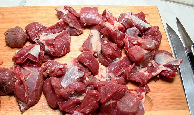 - Laten we het hoofdingrediënt van ons gerecht bereiden - varkensvlees. Het moet grondig worden afgespoeld onder stromend water. Laat het drogen of dep droog met keukenpapier. En vervolgens in middelgrote blokjes gesneden.