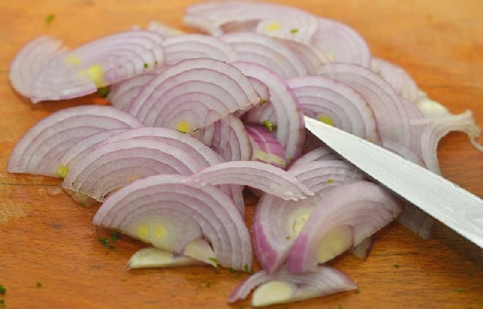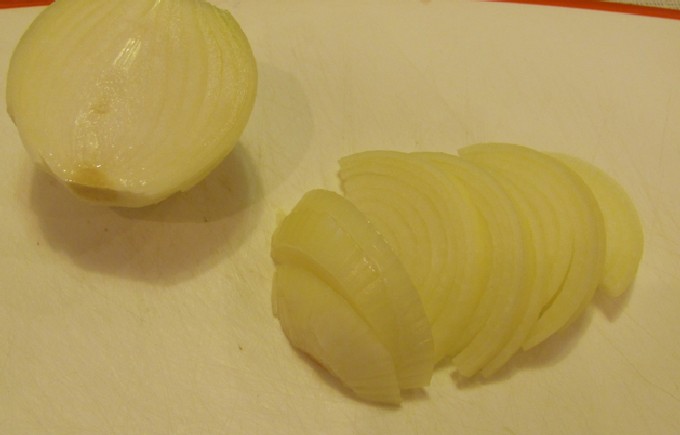 Op dit moment hakken we de ui, je kunt hem in stukjes of halve ringen snijden, zoals je wilt. En bak het.