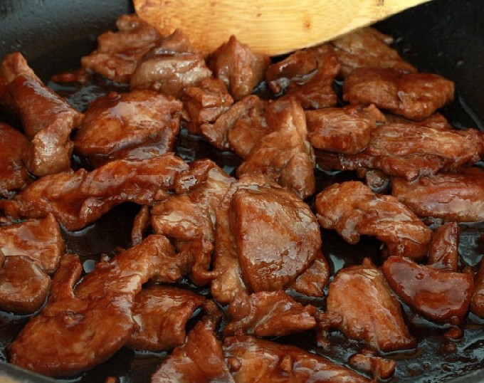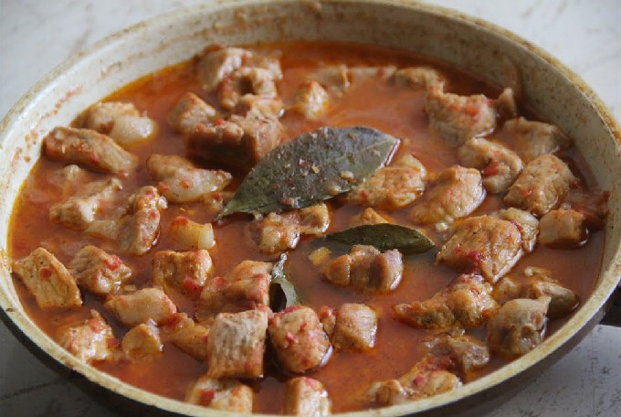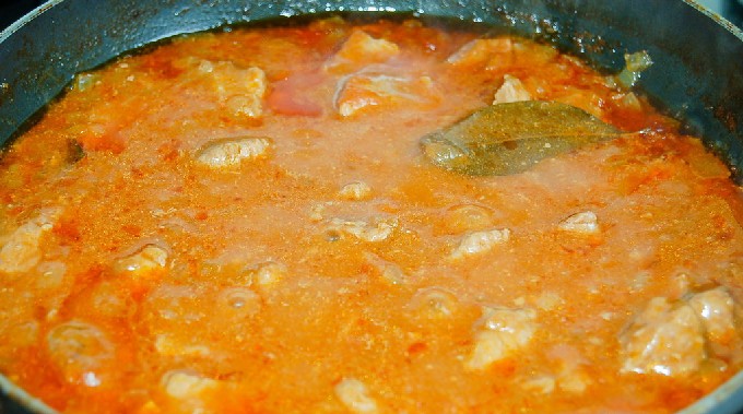 Giet het daarna in een pan met varkensvlees en laat het ongeveer 40 minuten sudderen. Houd het gerecht in de gaten, je moet het nogal vaak roeren, omdat de saus erg stroperig wordt.