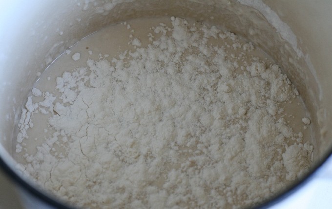 - Giet bloem in de pan, roer het.