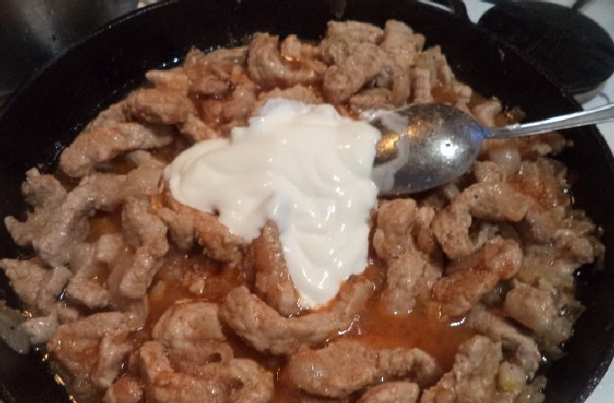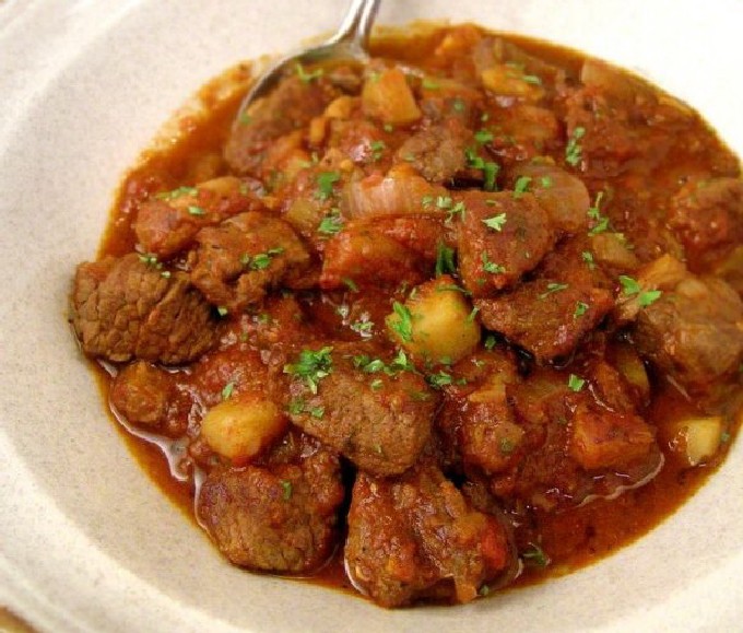 - Varkensgoulash met tomatenpuree en zure roomsaus