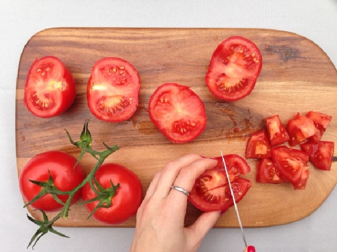 - Schil de bollen, snijd ze in kleine stukjes van willekeurige vorm. We snijden ook de tomaten, ze kunnen iets groter gesneden worden.