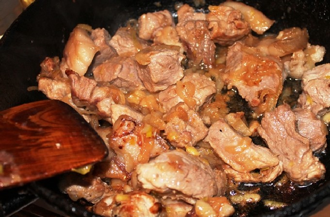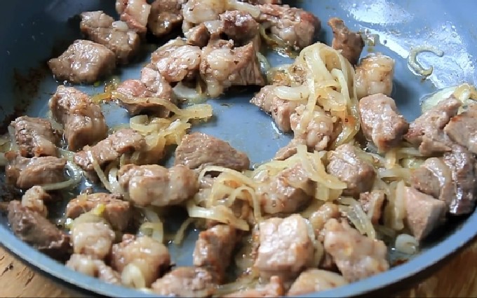 - Pel de ui en snij in kleine stukjes. Voeg toe aan vlees, bak een paar minuten.