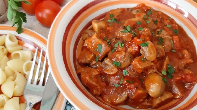Varkensgoulash met champignons is een geweldige manier om een bekend gerecht te diversifiëren en nog lekkerder te maken. Paddestoelentonen geven het varkensvlees een speciale smaak en maken de goulash smakelijker en voedzamer. Probeer het zelf! Nabestaanden zullen er zeker blij mee zijn!