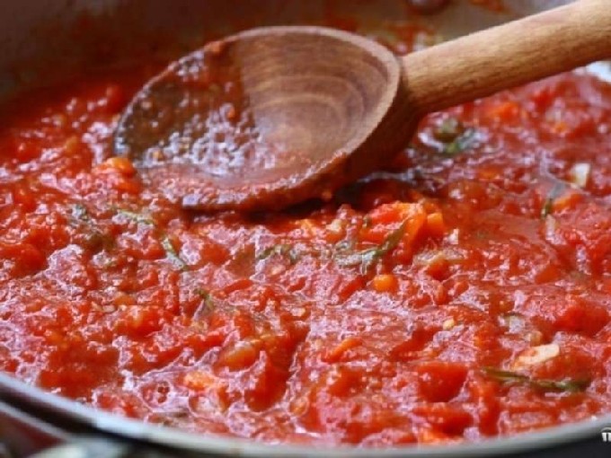 - Nu introduceren we tomatenpuree en zure room, giet bloemwater.