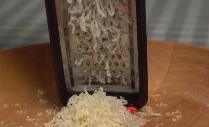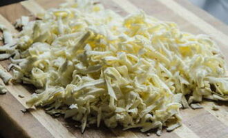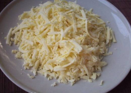 - Laten we in de tussentijd beginnen met het bereiden van de vulling. Je kunt zoveel kaas nemen als je wilt. Daarna wrijven we de kaas op een grove rasp.