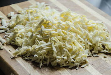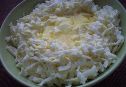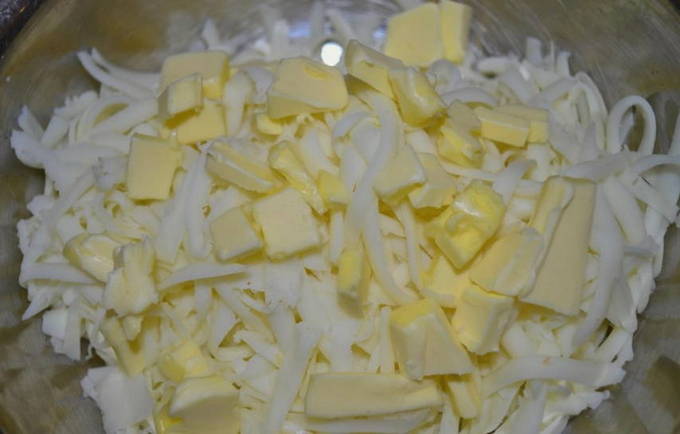 - Terwijl het deeg ontdooit, pakken we de vulling. Rasp een stuk suluguni kaas op een grove rasp en combineer met blokjes boter.