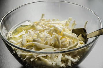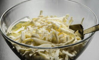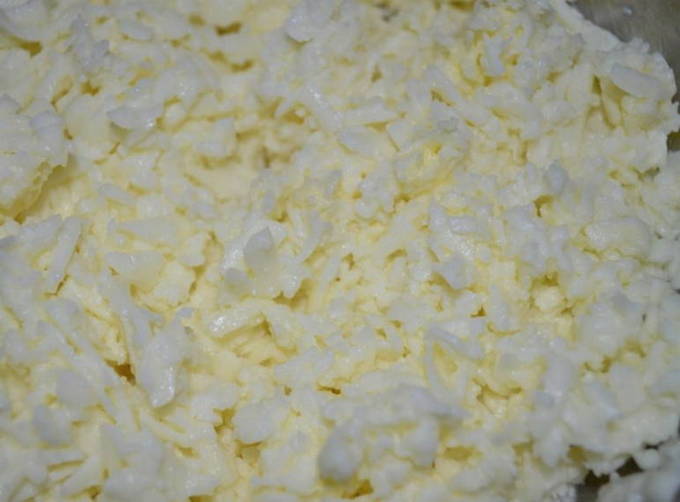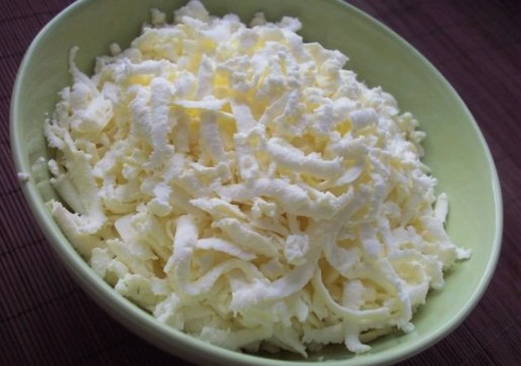 Ondanks dat de kaas zacht is, is het heel gemakkelijk om te wrijven als een stuk eerder in de koelkast of vriezer wordt bewaard. Daarna brengen we de gehakte kaas over in een droge kom.