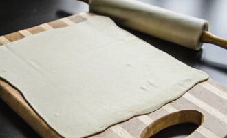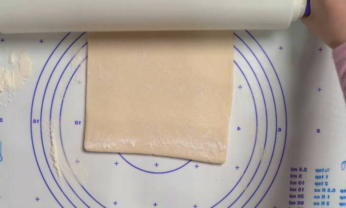 Voordat je met het deeg gaat werken, moet je het een beetje ontdooien. Wanneer het elastischer en buigzamer wordt, rolt u de laag met een deegroller tot een dikte gelijk aan ongeveer een halve centimeter.
