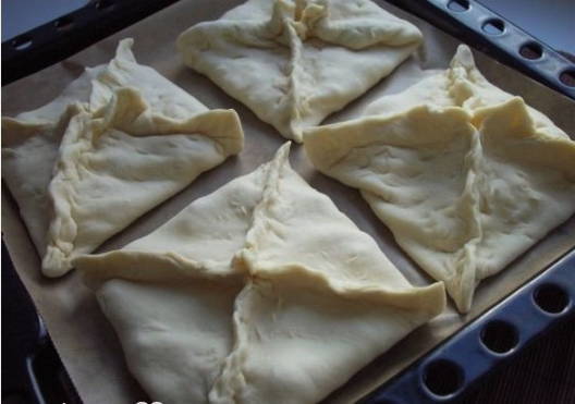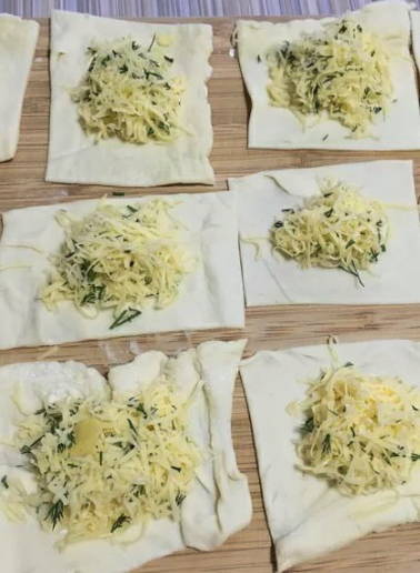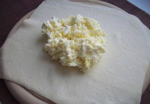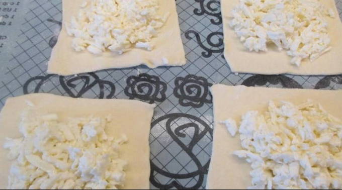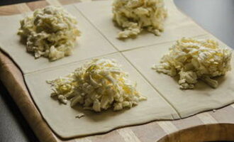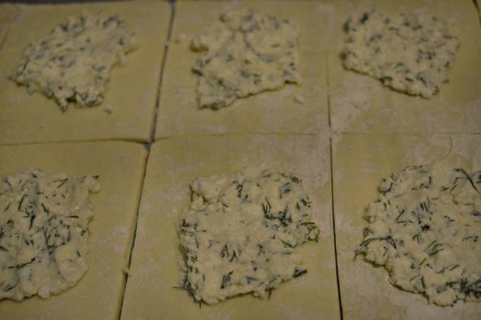 - Rol de deeglaag uit tot een dikte van 5 mm en snijd deze in vier gelijke vierkanten. Leg in het midden van het vierkant precies zoveel vulling als past. Kaas is immers het hoofdingrediënt in dit gerecht.