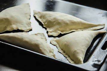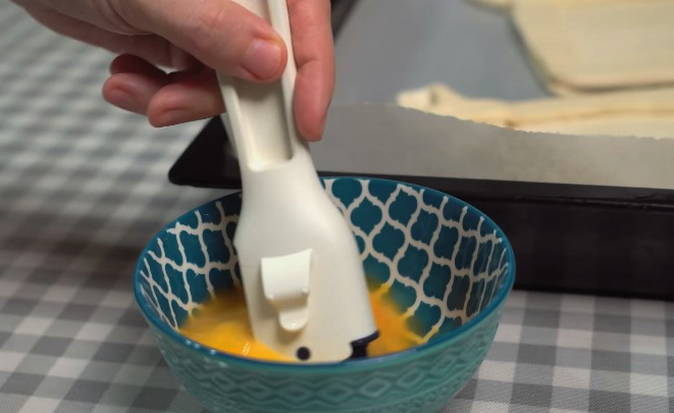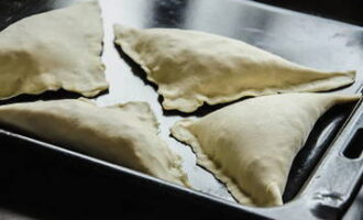 - We buigen de randen van de blanco's, terwijl we enveloppen vormen. Combineer vervolgens de dooier met melk en roer goed tot een gladde massa. We spreiden de blanco's op een bakplaat, zodat er weinig ruimte tussen is. Bedek ze tot slot met een dun laagje ei-melkmengsel, dek af met een theedoek en laat 20 minuten weken.