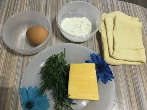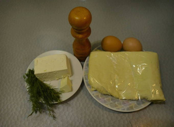 - We zullen alle ingrediënten bereiden die nodig zijn om te koken. We wassen het bosje dille en laten het drogen, ontdooi het bladerdeeg.