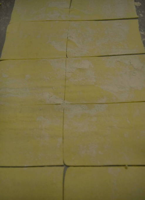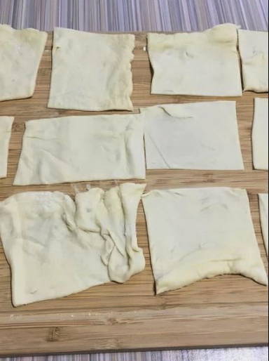 - We verspreiden de reeds ontdooide laag deeg op het werkoppervlak en bestrooien het met een dun laagje bloem. Daarna rollen we het uit met een deegroller, tot 5 mm dik en snijden het in verschillende vierkanten van dit formaat, afhankelijk van hoe groot je khachapuri wilt.