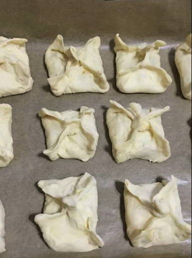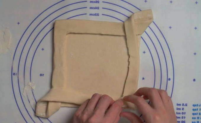 - Vervolgens overlappen we de ingesneden delen zodat er kleine zijkanten ontstaan. We brengen de blanco's over naar een bakplaat bedekt met een vel perkament.