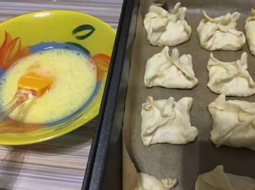 - We spreiden de voltooide vulling dichter bij het midden van de vierkanten, zodat u de randen gemakkelijk kunt buigen. Tegelijkertijd vormen we prachtige enveloppen. Terwijl we de oven aanzetten om op te warmen tot 200 graden, bestrijk je de bakplaat met een dun laagje boter.