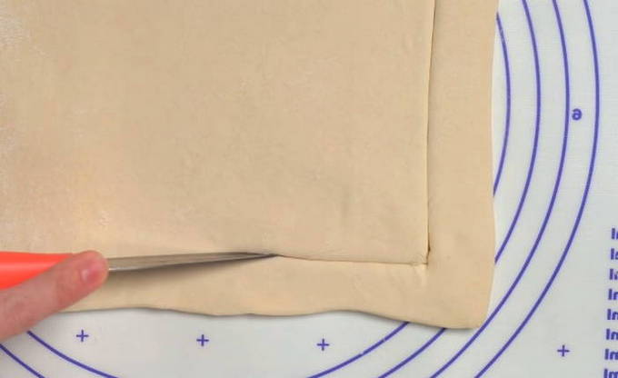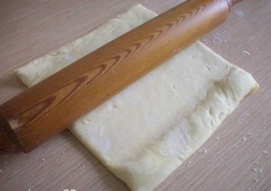 - Het is tijd om met de test te werken.We verspreiden de ontdooide laag op het oppervlak en besprenkelen het met bloem. Daarna rollen we het uit met een deegroller tot 3-5 mm dik en snijden het in vier gelijke vierkanten.