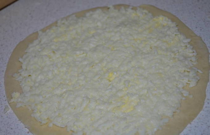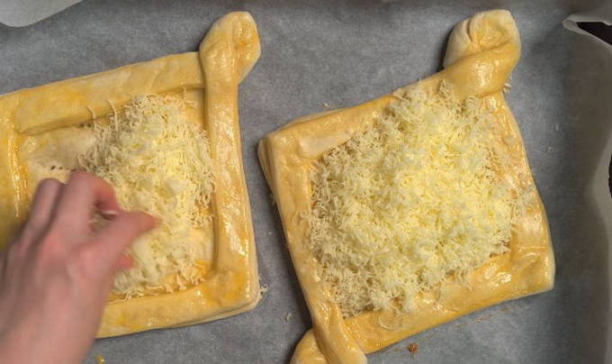 - Het is tijd om onze blanco's uit de oven te halen. Ze zijn al merkbaar gerezen en een beetje gebakken. Smeer de zijkanten in met de resten van hetzelfde ei en bedek het midden. En leg bovenop de laag met het ei de geplette kaas en verdeel deze gelijkmatig over het hele oppervlak.