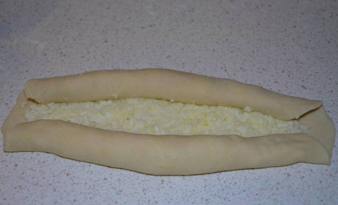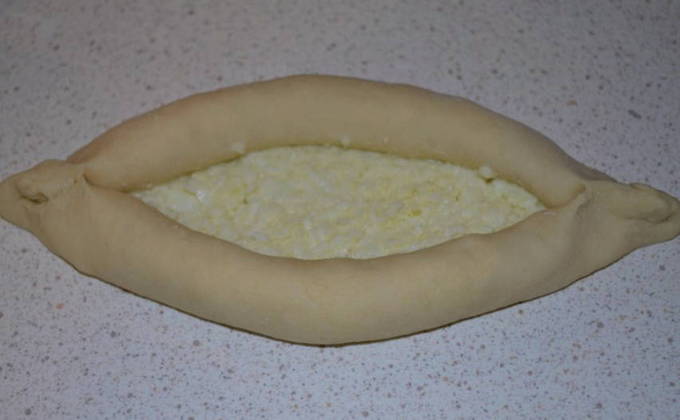 - Knijp ook voorzichtig de randen van beide uiteinden samen en vorm een mooie en langwerpige boot. Tijdens het bakproces zal het deeg respectievelijk enorm in omvang toenemen en zullen de khachapuri groter worden.