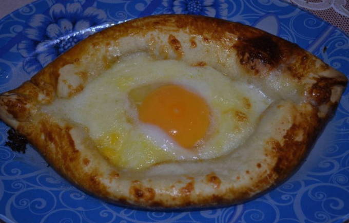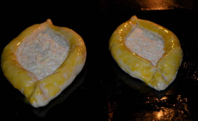 - Tegelijkertijd verwarmen we de oven tot 200 graden en bakken we er een half uur khachapuri in, tot er een goudbruin korstje ontstaat.