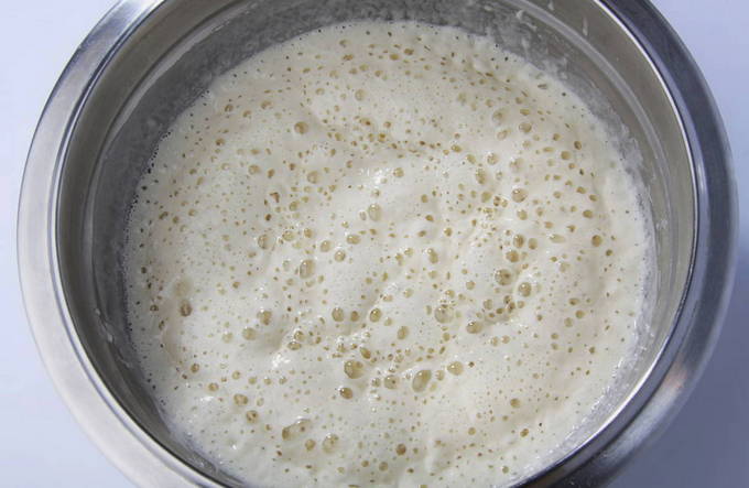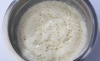 Meng in een kom 50 ml warme melk met een eetlepel suiker en gist. Laat het mengsel ongeveer 20 minuten in een warme ruimte staan zodat het gaat schuimen.