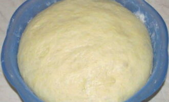 - Combineer melk en water, verwarm tot kamertemperatuur en meng met het voorbereide droge mengsel. Roer het deeg eerst door met een spatel of lepel en daarna met je handen. Het afgewerkte deeg zal glad, zacht en glad zijn. Het is bedekt met een film of servet en een uur gelaten, licht besmeurd met plantaardige olie.
