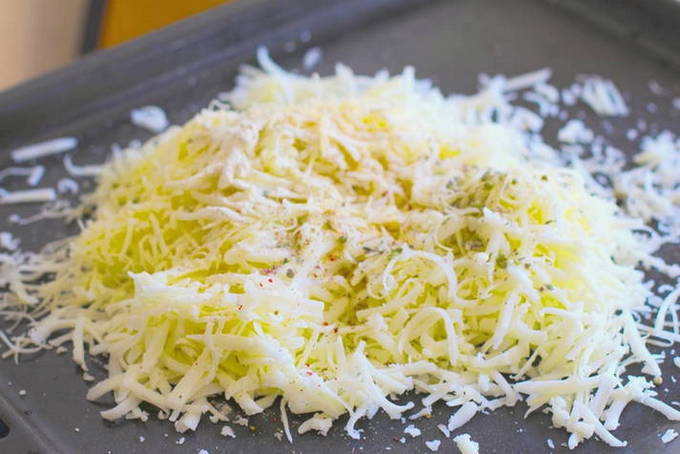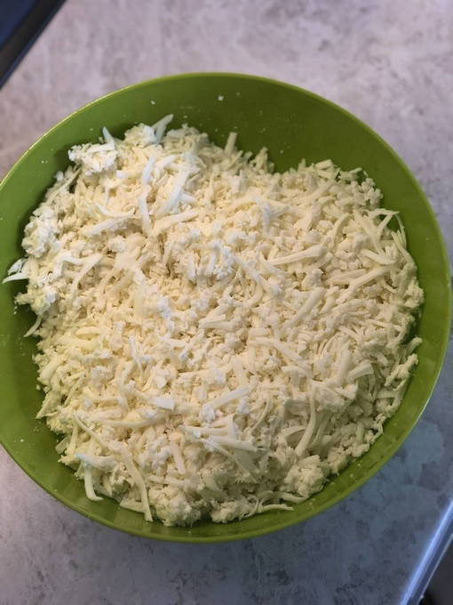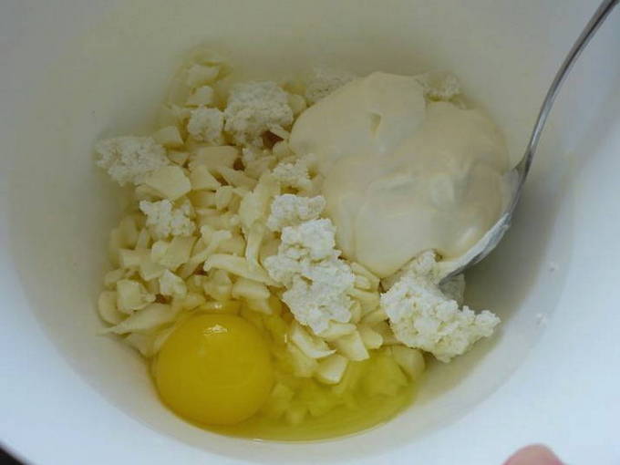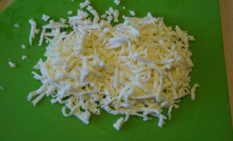 - Stukjes kaas worden op een handige manier ingewreven of in kleine blokjes gesneden, gemengd, voeg een beetje zout en kruiden toe.